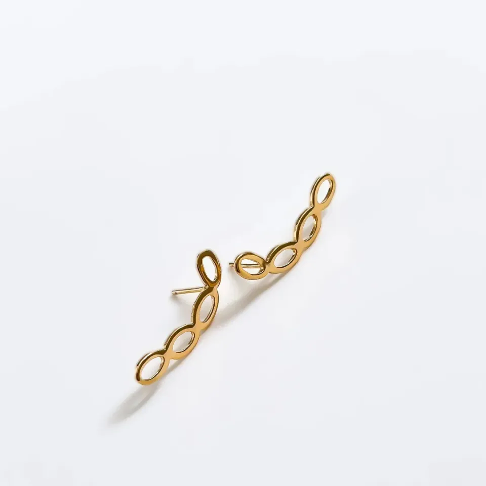 Este tipo de brinco é projetado para envolver a orelha, geralmente começando na parte inferior e subindo ao longo da cartilagem, sem a necessidade de uma perfuração adicional. O design vasado adiciona um elemento de delicadeza e intriga ao ear cuff, permitindo que a pele e a luz brilhem através dos espaços vazados.