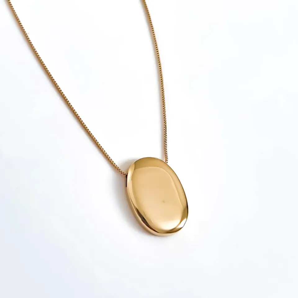 Um colar com pingente oval liso seria uma peça minimalista e elegante. A forma oval é clássica e atemporal, enquanto a superfície lisa adiciona uma sensação de simplicidade e sofisticação ao design.