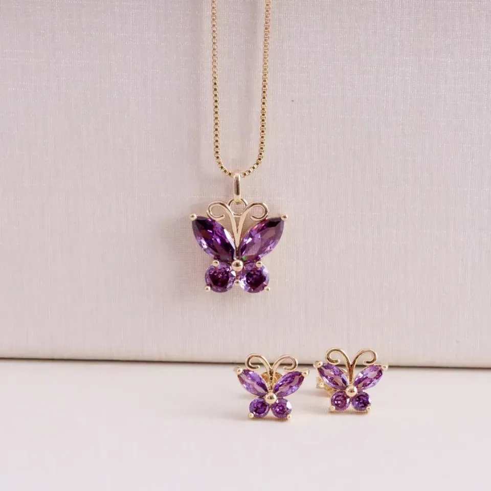 CONJUNTO BORBOLETA LAVANDA CRISTAIS BANHADO A OURO 18K AJUSTÁVEL 45CMConfira opiniões e avaliações de clientes!