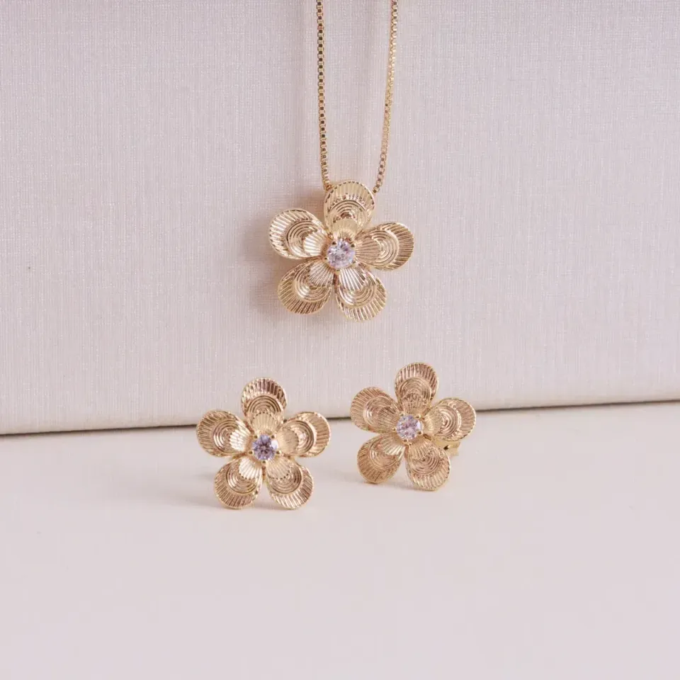 CONJUNTO FLOR COM CRISTAL MEIO BANHADO A OURO 18K AJUSTÁVEL 45CMConfira opiniões e avaliações de clientes!